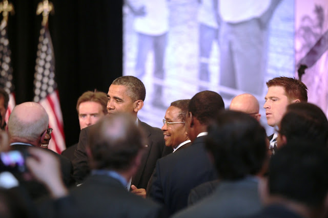 President Barak Obama of the United States of America introduces President Jakaya Kikwete as he acknowledges the presence of four African leaders present symposium themed "Food Security at the G-8: Changing the development landscape" at the Ronald Reagan building and International Trade Centre in Washington DC. The session outlined key components of the G8 deliverables for food and nutrition security. Others were HE Meles Zenawi, Prime Minister of Ethiopia, Prof. John Evans Atta Mills, President of Ghana and African Union Chairman and President of Benin, HE Dr Boni Yayi.
